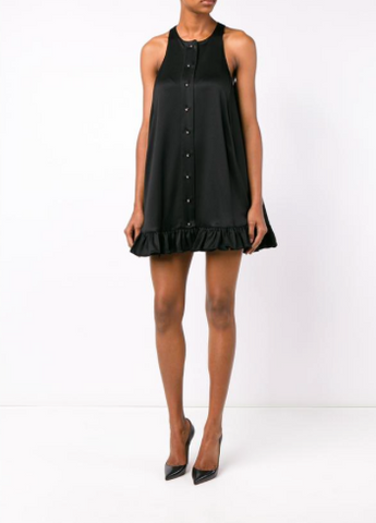This shiny black Roland Mouret Lumley cocktail dress from the coveted designer reworks a classic shape by adding a slight racer-back and armholes cut high up the sleeveless design for an extra edge. The asymmetric darts and diagonal pleats accentuate the shiny black satin, giving the piece another interesting 3D dimension. The top-to-bottom back zip in gold tone adds instant...